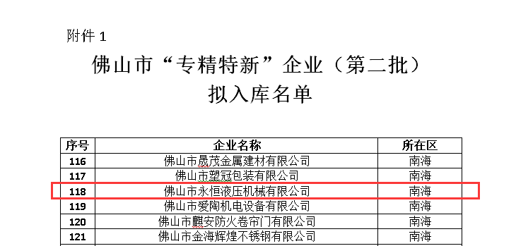 永恒液壓憑借廣闊的市場(chǎng)空間、產(chǎn)品用途的專門性、生產(chǎn)工藝的專業(yè)性及自主技術(shù)的專有性,成功入庫(kù)佛山市“專精特新”企業(yè)。